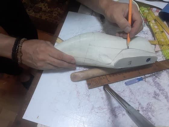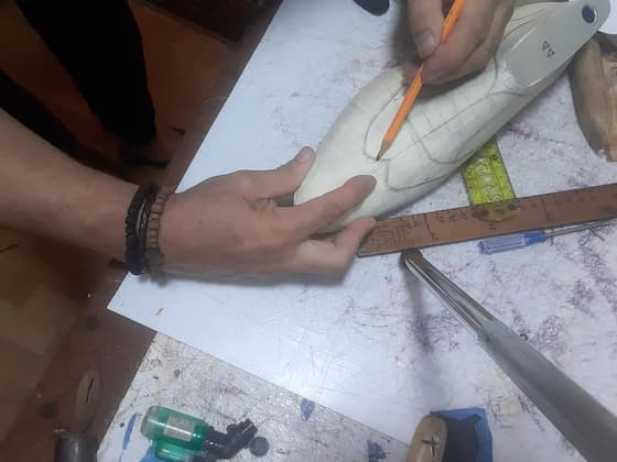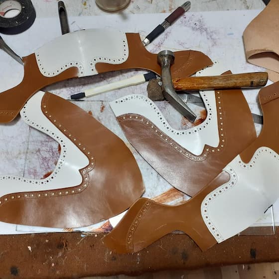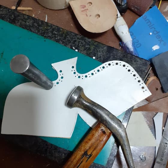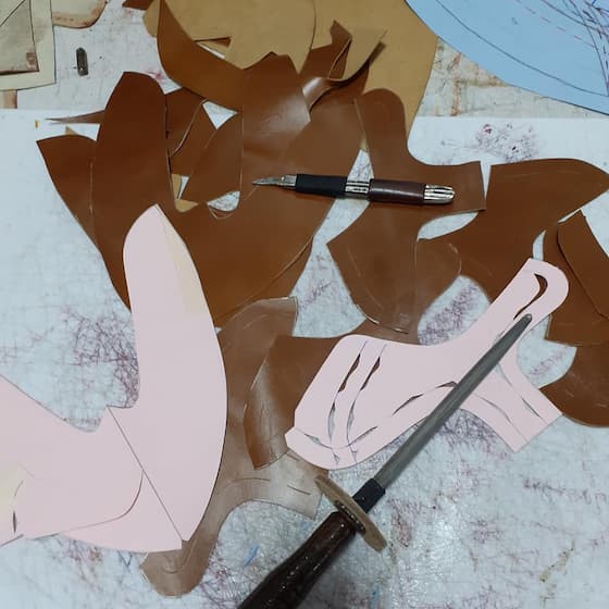 Zatim se pravi šablon na osnovu željenog modela i veličine stopala. Modeliranje se vrši ručno koristeći krep traku , a veliki sistemi rade to digitano uz pomoć specijalnih softvera. Koža se precizno seče po šablonu. Ovde je neophodna preciznost jer svaka greška utiče na udobnost.
